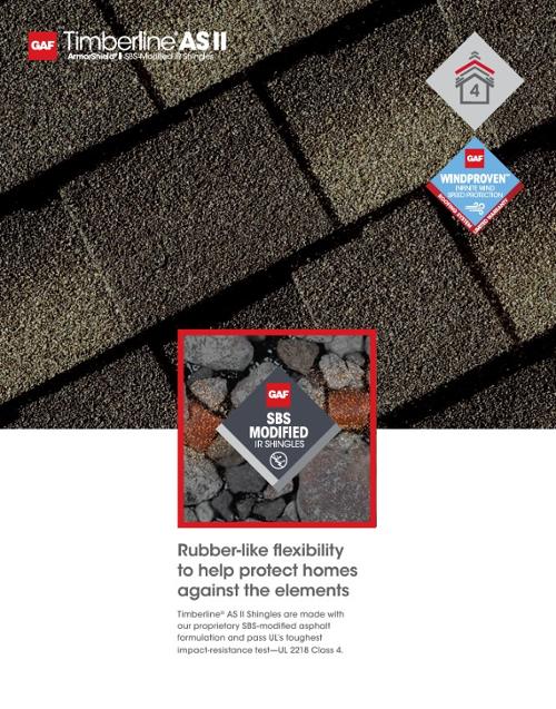 Timberline ArmorShield II Impact-Resistant Shingles offer extra protection with the beauty of Timberline — all in one shingle! Timberline® AS II Shingles are made with GAF's proprietary SBS-modified asphalt formulation and pass UL’s toughest impact-resistance test — UL 2218 Class 4. That means they can really take a punch from Mother Nature.