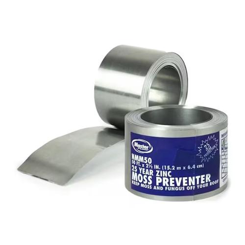 The Master Flow™ Zinc Moss & Mildew Preventer NMM50 installs easily near the roof ridge to help protect your roof against moss and mildew growth. The zinc strip does not kill moss or mildew but helps inhibit their growth to help reduce the need for roof related to moss and mildew. The zinc strip is installed along both sides of the ridge of the roof, with most of the strip left exposed. The exposed zinc strip will oxidize and leach zinc oxide when it rains to help inhibit the moss and mildew growth.