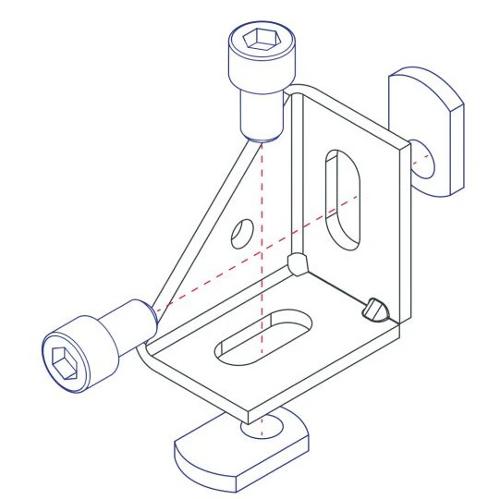The 2 hole - inside corner bracket with single support is an external fastening method that creates a 90 degree connection. The single support provides additional strength while the slotted mounting holes allow for greater adjustability between the connecting profiles. This bracket requires no machining services and can provide infinite positioning along the profile T-slot.