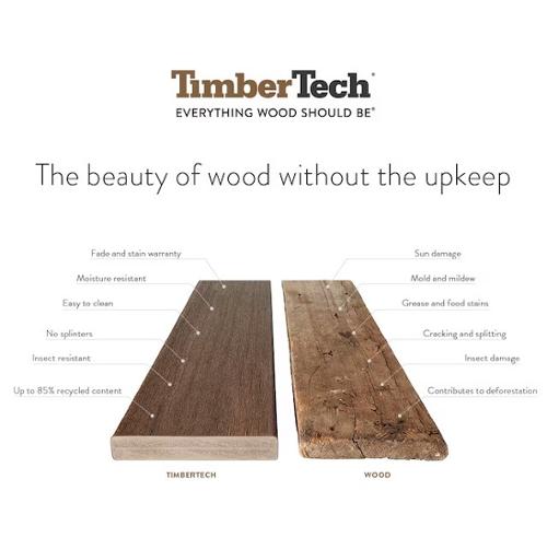 variable grain pattern, each board is unique for clients looking for a one-of-a-kind final deck appearance. Capture the essence of nature with unique board-to-board variation (no two are exactly alike), without the rigorous maintenance of wood. Featuring a character-rich Hand-Scraped texture and dynamic blend of hues, TimberTech's premium polymer capped composite boards deliver real wood aesthetics you’ll never have to sand, stain, or seal.