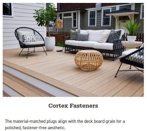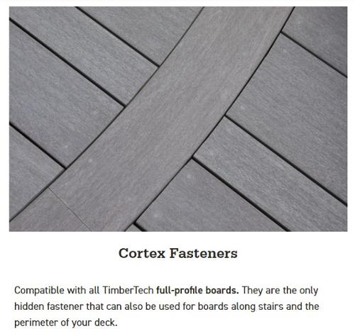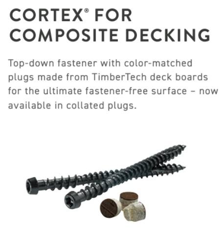 Cortex Concealed Fastening System for Decking is a fast and easy way to conceal fasteners and screw heads when installing decking boards. Installation is easy by using two screws per joist connection. The FastenMaster Cortex box includes everything needed, including screws, plugs and setting tools. FastenMaster recommends installing with an 18 volt cordless drill with 1/2" chuck or a corded drill with 1/2" chuck.